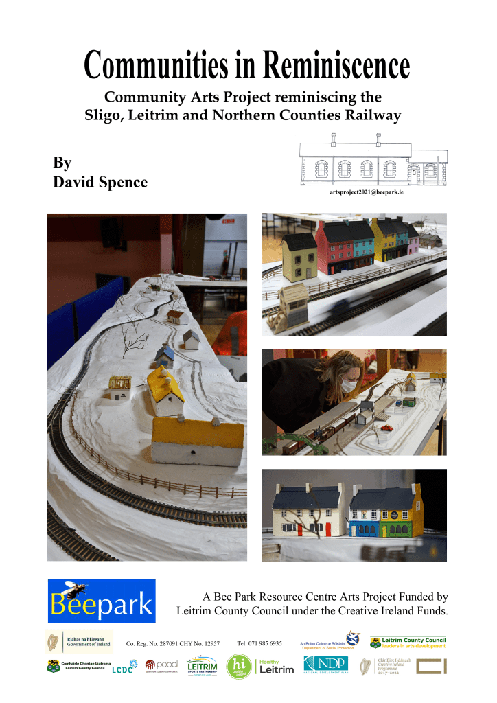 Communities in Reminiscence was a project devised by David Spence in association with the Bee Park Community Centre. Groups using the centre were engaged to construct the models and landscape for the reminiscence of the old SLNCR, which closed down in September 1957. Various artists were engaged to deliver training, and the whole was co-ordinated by David Spence. The project was funded by Leitrim County Council under the Creative Ireland Funds.